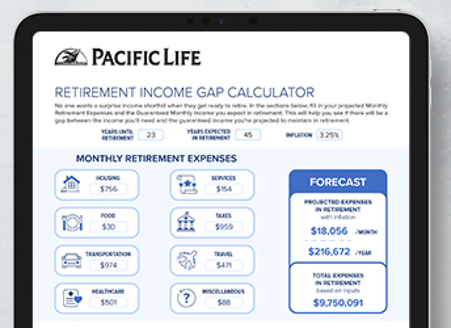 No one wants a surprise shortfall when it comes to the money they need in retirement. So, clients are counting on you to help ensure there won't be one. Our Retirement Income Gap Calculator is a simple, interactive way to help clients identify essential future expenses and expected sources of guaranteed money to expose any gaps in income needs. Clients with gaps may find that an annuity could be a way to help cover that shortage.