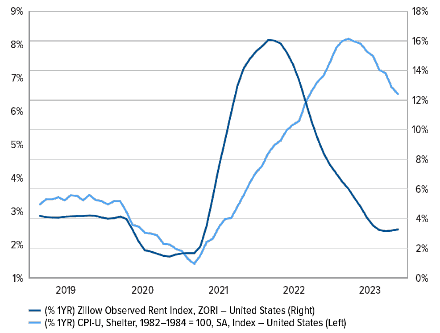 The Federal Reserve (Fed) paused rate hikes during the last three Federal Open Market Committee (FOMC) meetings of the year. Unless inflation pressures resurface, the Fed is likely finished with its rate- hike cycle. At the time of this commentary, the market consensus suggests that the Fed will pursue interest-rate cuts sooner rather than later, with the first cut coming as early as March 2024. However, this view is based on core inflation heading toward the Fed’s target of 2% during the next several months.