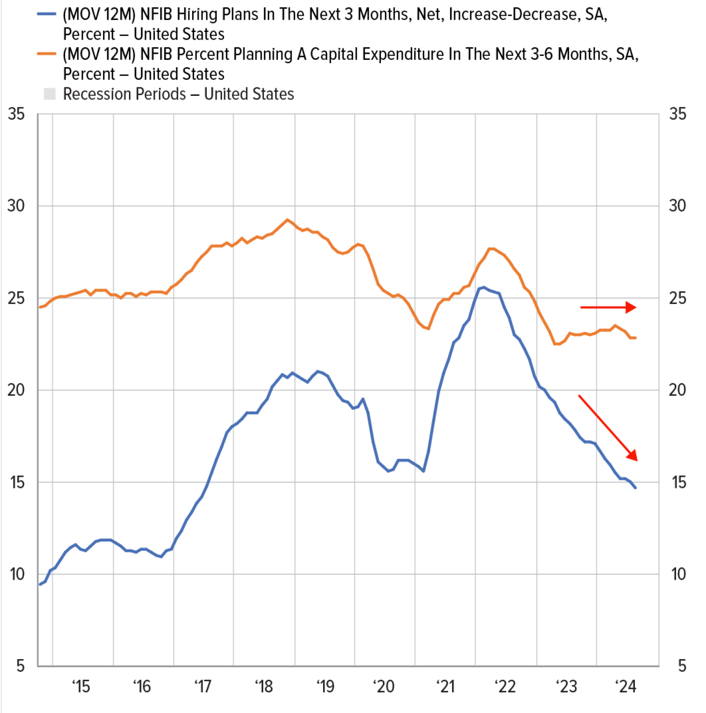 The tight election races, uncertainty about policy outlook, and elevated interest rates may have caused companies to slow or stall capital expenditure and hiring plans until election results are certain and the Fed helps lower borrowing costs. This is observed in the following chart, which illustrates the lack of expansionary business plans.