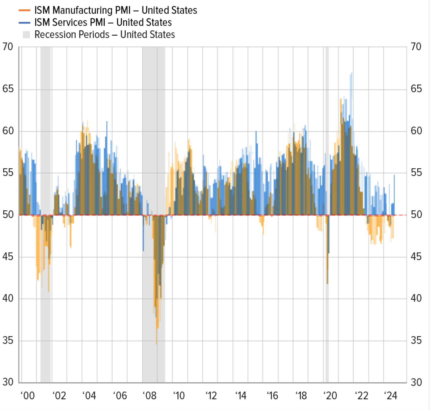 Complicating the economic outlook, Presidential and congressional elections will occur during the fourth quarter of this year. At the time of publication, all elections (i.e., presidential, U.S. Senate, and U.S. House of Representatives) remain extremely tight, considering the margin of error. From the market’s perspective, a mixed result between Democrats and Republicans would be preferable, as that would likely keep policies relatively unchanged. Several studies suggest the S&P 500 index has generally performed well under a Democratic president and a divided U.S. Congress, although Republican presidents and with a divided Congress also have yielded positive market gains. While politicians may be frustrated by the difficulty of passing bills and new policies, markets prefer more certainty and maintenance of the status quo.