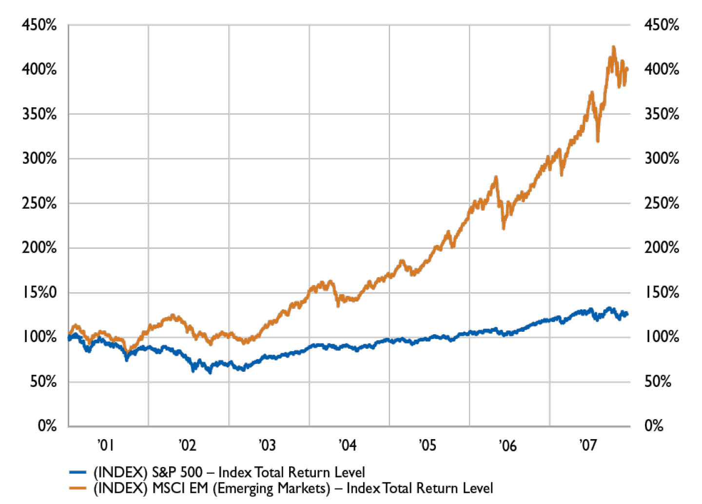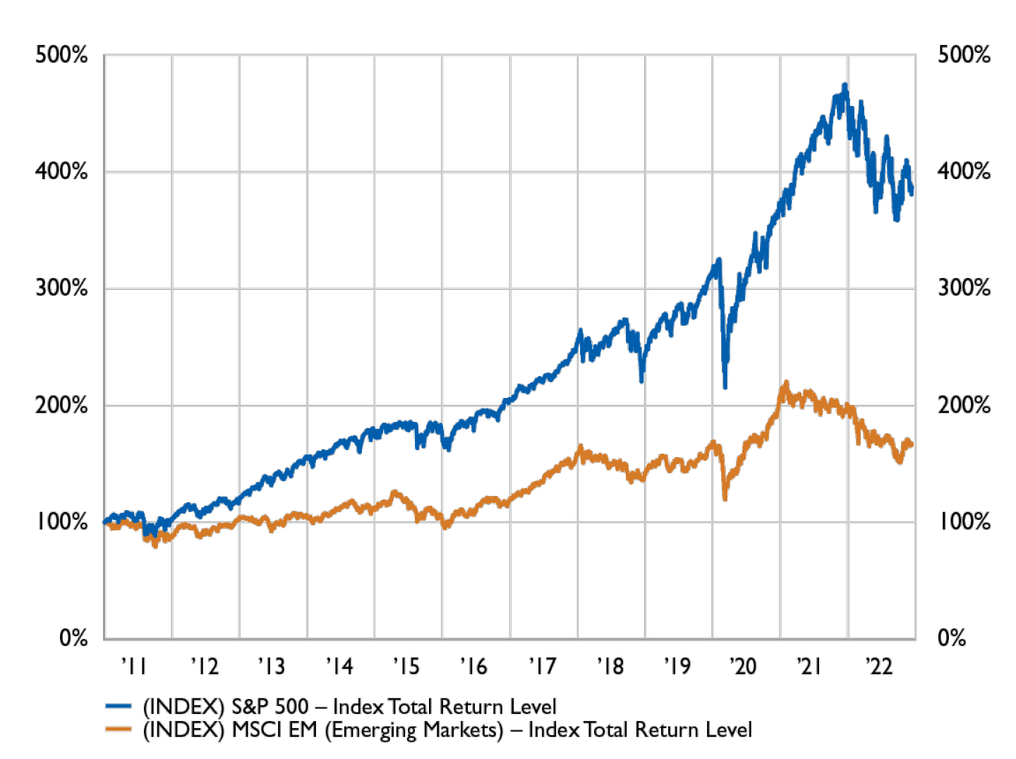 Many studies have shown that asset-allocation decisions can explain roughly 40% to 90% of the variance of a portfolio’s performance.1 This suggests strategic and active asset allocation is vital to overall portfolio performance. For instance, the decision between allocating to U.S. equities and emerging markets can have a significant impact on a portfolio’s performance over time.